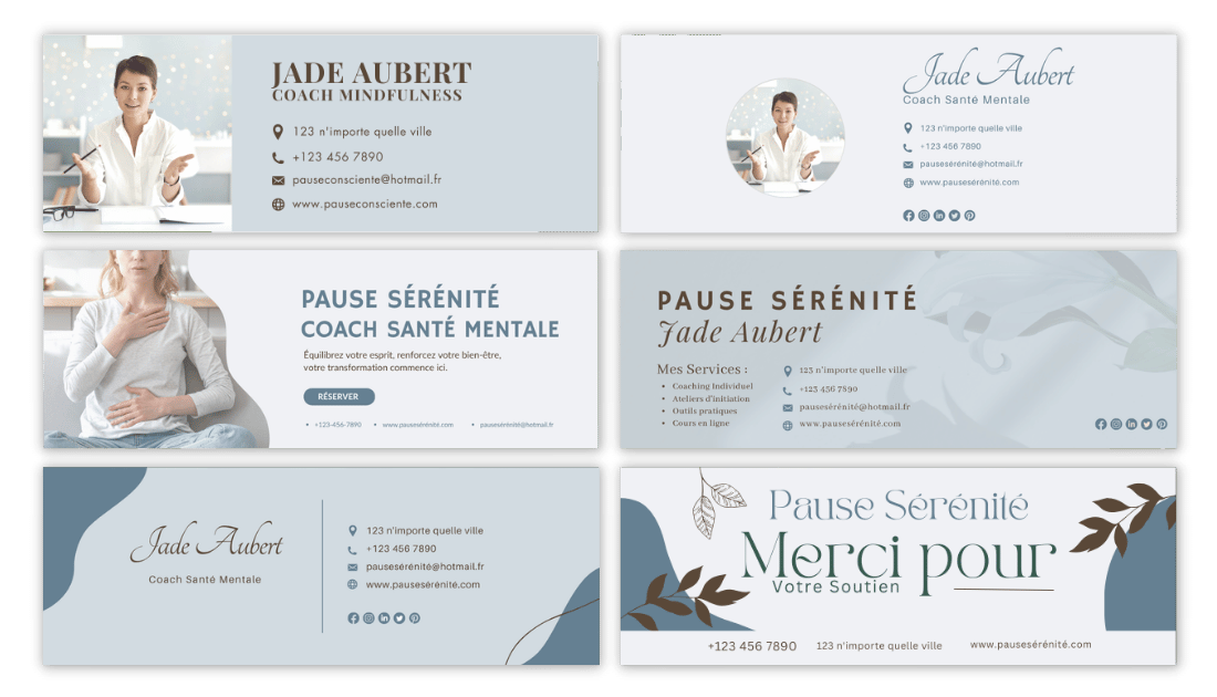 Incorporer ces designs en pied de page de vos email pour améliorer l'apparence professionnelle de vos échanges par email avec vos clients.